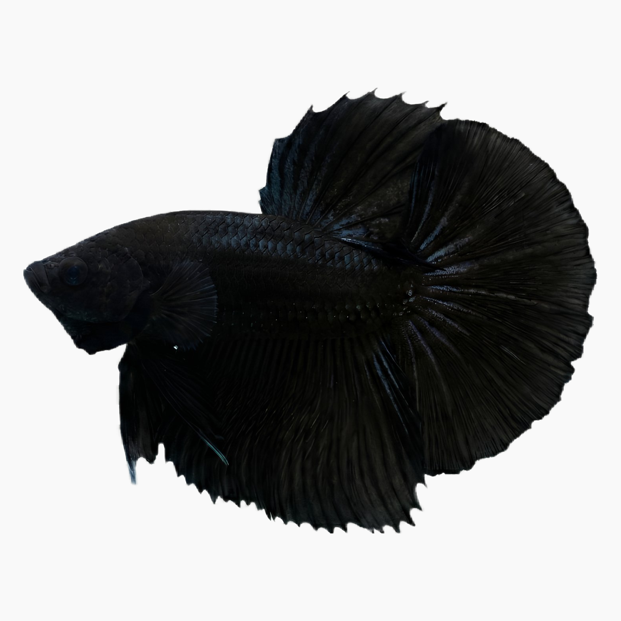 The Melano Black Full Moon Betta is one of the most sought-after Betta varieties, admired for its deep jet-black coloration and perfectly rounded 180° caudal spread. When flared, the fins form a near-perfect circle, creating a bold, commanding presence that instantly becomes the centerpiece of any aquarium.